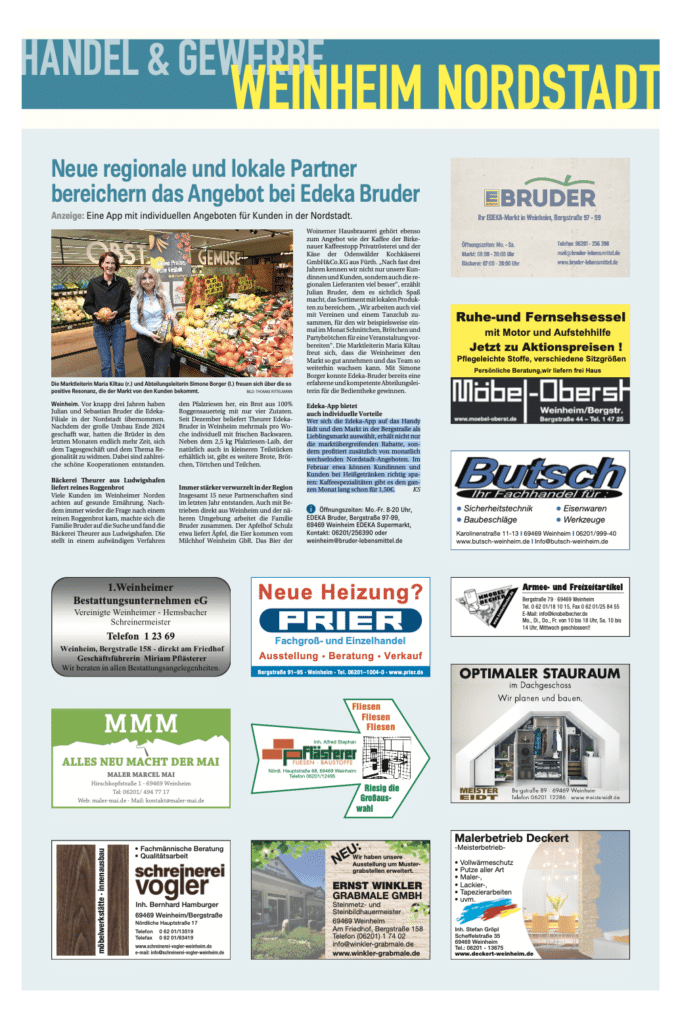 Weinheim. Vor knapp drei Jahren haben Julian und Sebastian Bruder die Edeka- Filiale in der Nordstadt übernommen. Nachdem der große Umbau Ende 2024 geschafft war, hatten die Brüder in den letzten Monaten endlich mehr Zeit, sich dem Tagesgeschäft und dem Thema Re- gionalität zu widmen. Dabei sind zahlrei- che schöne Kooperationen entstanden.